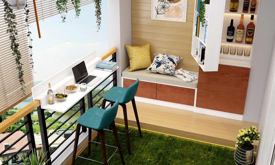This balcony space is the ultimate entertainment zone for both book lovers and party hoppers. It includes multipurpose furniture with comfortable seating, perfect for an evening with your loved ones
